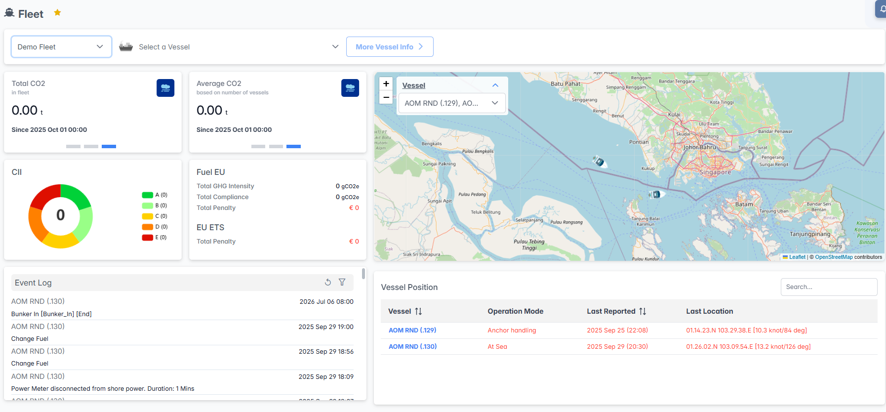 The Fleet Dashboard interface integrates vessel selection, consumption monitoring, compliance tracking, event logging, and real-time vessel positioning to provide complete fleet oversight. Users can monitor fleet-wide performance metrics, track individual vessel operations, and access detailed operational data for comprehensive fleet management.