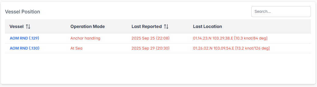 - Sortable Columns: Click column headers to sort by vessel name, operation mode, or last reported time