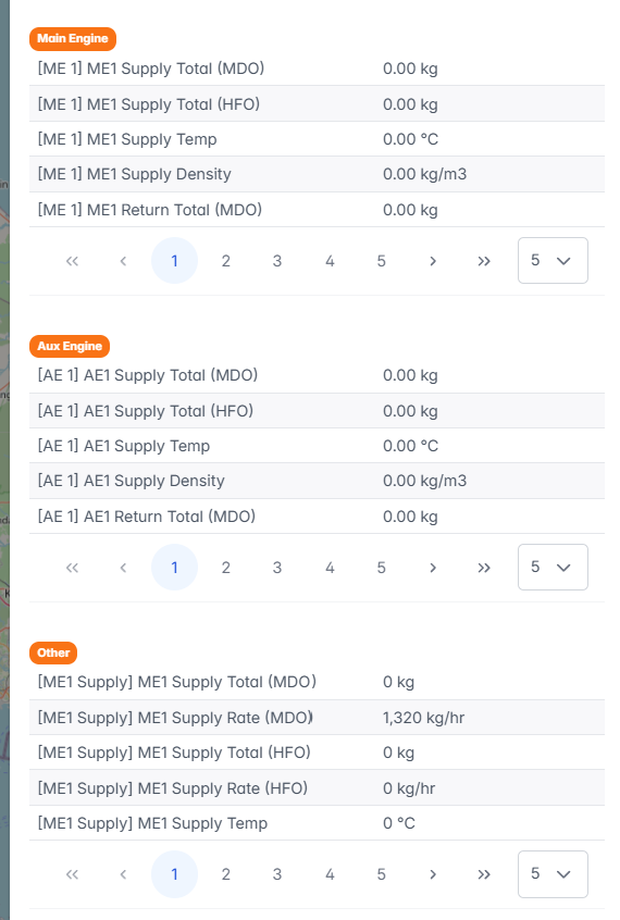 Telemetry Groups: Metrics organized by system. Each group (Main Engine, Aux Engine, Other) lists named metrics in rows with their latest value and units. Typical presentation: