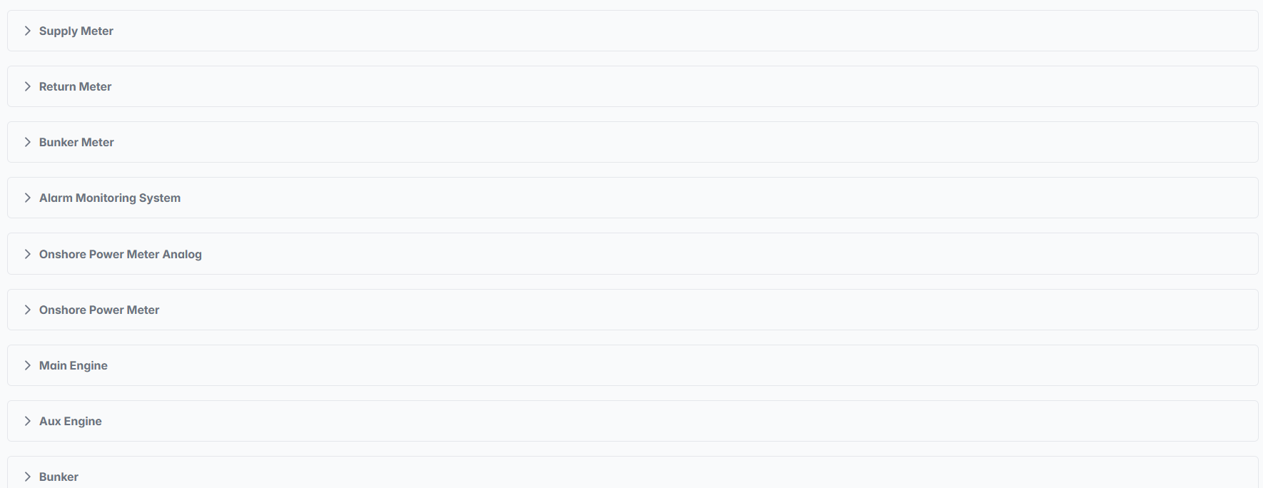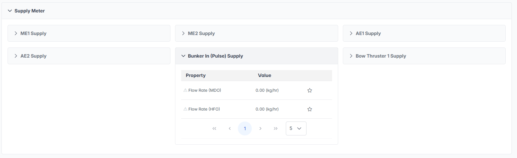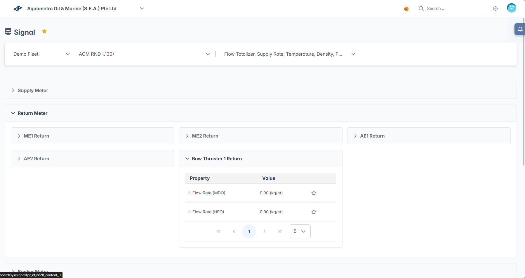 The Signal Dashboard provides comprehensive monitoring and analysis of vessel sensor data and measurement parameters within the AOMP. This interface allows users to monitor fuel flow rates, supply and return meter readings, engine parameters, and other critical vessel signals in real-time for operational oversight and performance analysis.