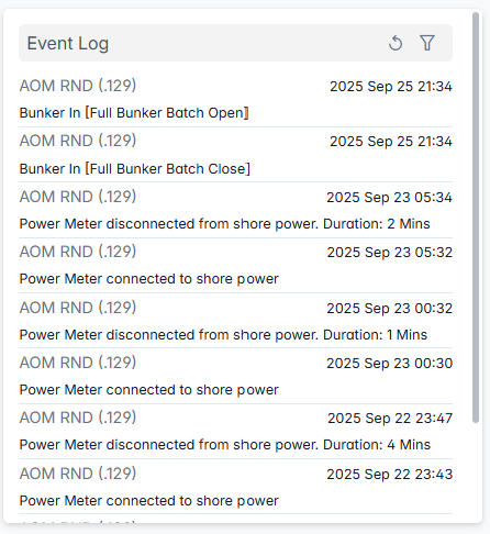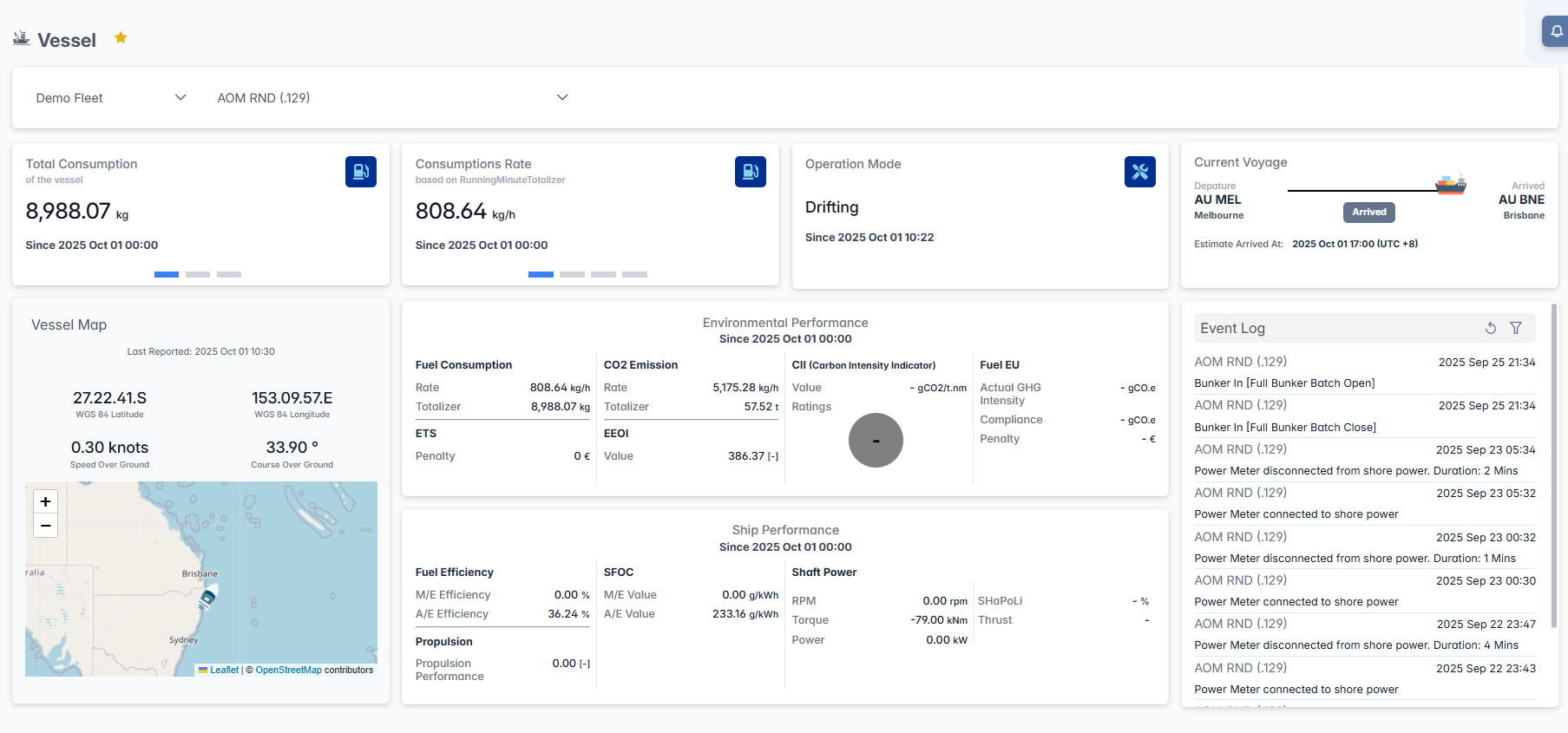 The Vessel Dashboard interface integrates vessel selection, consumption monitoring, operational status tracking, environmental performance analysis, and real-time event logging to provide complete individual vessel oversight. Users can monitor vessel-specific performance metrics, track operational efficiency, and access detailed analytics for comprehensive vessel management.