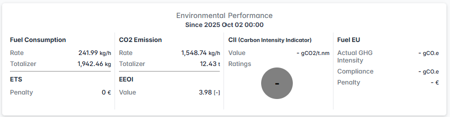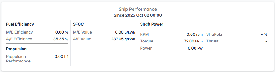 The Vessel Dashboard provides comprehensive monitoring and analysis capabilities for individual vessels within the AOMP. This detailed interface allows users to monitor vessel performance, track fuel consumption, analyze environmental metrics, and review operational status through an integrated dashboard combining real-time data visualization and detailed performance analytics.